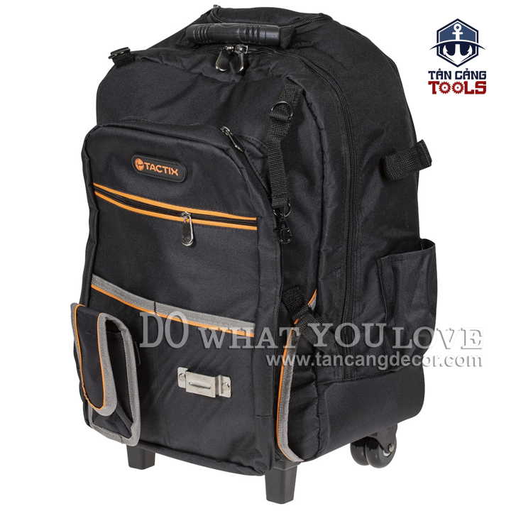 THÔNG TIN SẢN PHẨM: Thương Hiệu : TACTIX Mã Hiệu : 323157 Xuất Xứ : Trung Quốc. Màu Sắc : Màu Cam – Đen Chất Liệu : Vải Oxford Chống Nước. Kích Thước Túi : Ngang 360 x Rộng 210 x Cao 500 mm. Trọng Lượng : 3000 Gram. Bao Gồm 20 Ngăn, 6 Khóa Kim Loại. Trang Bị 2 Bánh Xe Di Chuyển Mặt Sau Và 2 Đế Cố Định Cứng Mặt Trước. Sức Tải : 40 Kg.