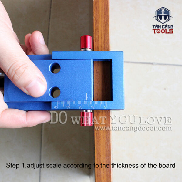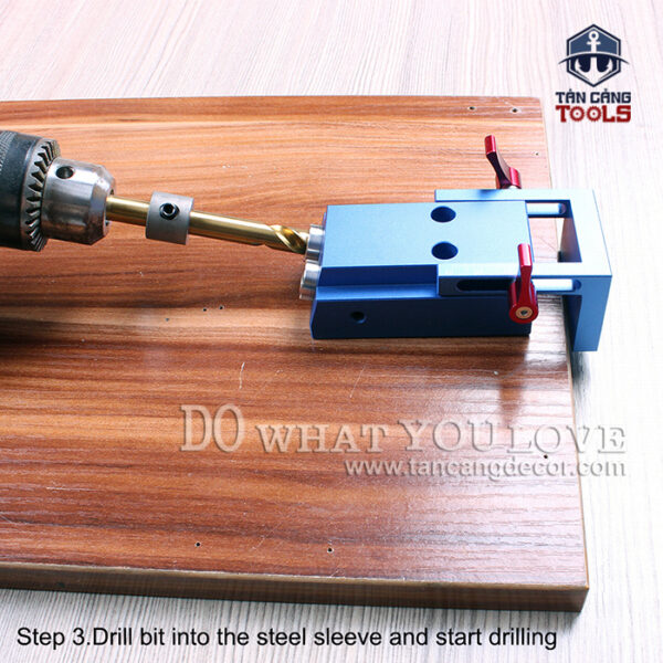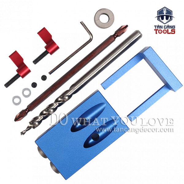 Thân bộ gá bằng hợp kim nhôm 6061; lỗ dưỡng khoan bằng kim loại. Có khả năng thay đổi linh hoạt tương ứng với độ dầy tấm gỗ cần khoan.