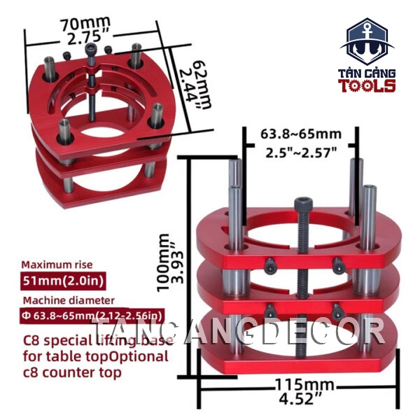 - Bộ Cử, Mặt Gá Nâng Hạ Máy Phay Cầm Tay Nhôm Anode – Đường Kính Máy 65 mm là dòng sản phẩm hỗ trợ nâng hạ máy phay cầm tay, giúp thao tác phay chuẩn xác và tăng tính an toàn.