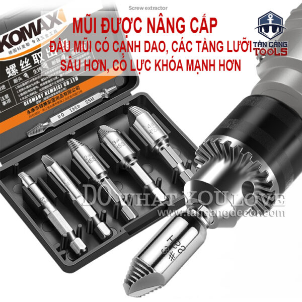 THÔNG TIN SẢN PHẨM: Thương Hiệu : KOMAX Mã Hiệu : 0203 Xuất Xứ : Trung Quốc Chất Liệu : Thép HSS cao cấp Màu Sắc : Màu Vàng. BỘ SẢN PHẨM BAO GỒM : 5 mũi bước ren mịn tổng chiều dài 55 mm và 1 mũi khoan 3 mm đi kèm. Sử Dụng Chuôi Lục Giác 6.35 mm Dòng Mũi Được Nâng Cấp Chất Liệu, Các Tầng Lưỡi Sâu Hơn Cho Khả Năng Mở Vít Tốt Nhất. + Số 1 : 2 – 4.9 cm dùng cho vít 1-3 mm + Số 2 : 6 cm dùng cho vít 4 – 6 mm + Số 3 : 7 cm dùng cho vít 5 -7 mm + Số 4 : 10 cm dùng cho vít 8 -10 mm + Số 5 : 11 cm dùng cho vít 10 – 12 mm + Số 6 : 12 cm dùng cho vít 6 – 16 mm