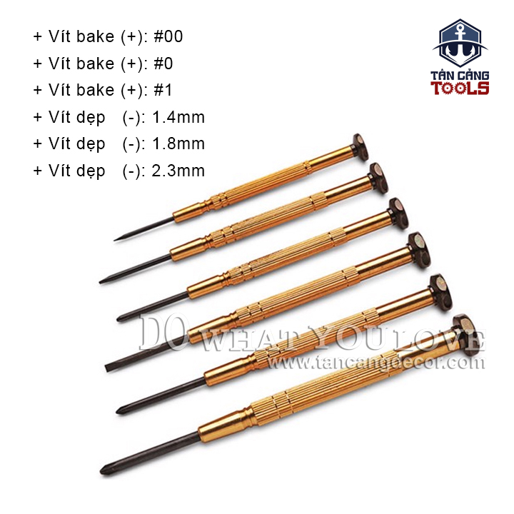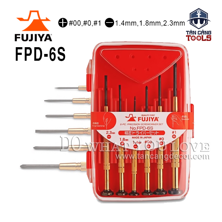 THÔNG TIN SẢN PHẨM: Thương Hiệu : FUJIYA Xuất Xứ : Nhật Bản Mã Hiệu : FPD-6S Chất Liệu : Thép Hợp Kim – Cán Cầm Đồng Thau Trọng Lượng : 167 Gram. Kích Thước Hộp : 191x110x25 mm Sử Dụng Cần : 1/4 Inches ( 6.35 mm ) SẢN PHẨM BAO GỒM 6 Chi Tiết : + # 00, # 0, # 1 -1.4mm, 1.8mm, 2.3mm + 1 Vít bake: #00 + 1 Vít bake: #0 + Vít bake: #1 + Vít dẹp: (-)1.4mm + Vít dẹp: (-)1.8mm + Vít dẹp: (-)2.3mm
