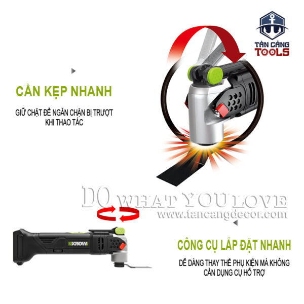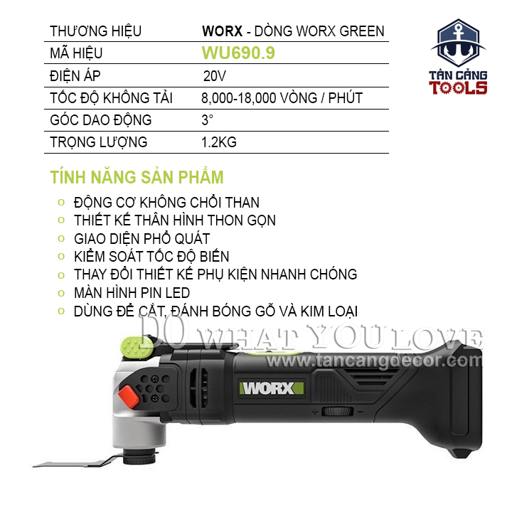THÔNG TIN SẢN PHẨM: Xuất Xứ : Trung Quốc Sản Xuất Theo Tiêu Chuẩn Mỹ Thương Hiệu : WORX Hàng Chính Hãng https://www.worx.com Mã Sản Phẩm : WU690.9 Sử dụng động cơ không chổi than. Trọng Lượng : 1.2 Kg Vòng Tua : 8,000 – 18,000 Vòng/Phút Góc Dao Động : 3° Có Đèn Pin. Có Chế Độ Điều Tốc. Ứng Dụng Công Nghệ Kẹp Lưỡi Nhanh Mới. BỘ SẢN PHẨM BAO GỒM: ( Chưa Bao Gồm Pin, Sạc ) + Thân Máy + Bộ giấy chà nhám 36 cái (40#, 80#, 120#) + 3 lưỡi cắt sâu 10/28/45mm + Lưỡi cắt hình bán nguyệt x1 80mm + Lưỡi lóc phôi. + Đế chà nhám + Vali nhựa + Ty trục. Sản Phẩm Bảo Hành Điện Tử 12 Tháng Từ Weldcom.
