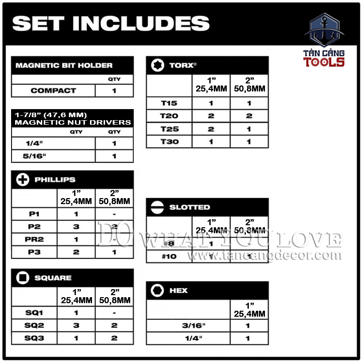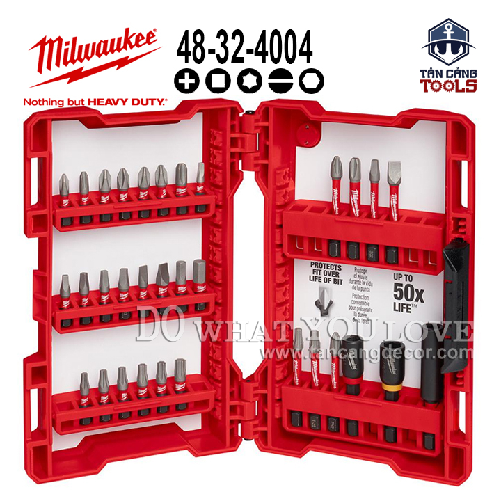 THÔNG TIN SẢN PHẨM: Xuất Xứ : Trung Quốc Sản Xuất Theo Tiêu Chuẩn Mỹ Thương Hiệu : MILWAUKEE Hàng Chính Hãng https://www.milwaukeetool.asia/ Mã Sản Phẩm : 48 – 32 – 4004 Chất Liệu : Thép Alloy 76 Được Xử Lí Nhiệt Có Độ Bền Tối Đa. Sử Dụng Chuẩn Đuôi Ngắn Lục Giác 6.35 mm. Trọng Lượng : 450 Gram. SẢN PHẨM BAO GỒM: 32 Chi Tiết Kèm Hộp : + One (1) Torx Bit 2″ T25 + One (1) Torx Bit 2″ T20 + One (1) Torx Bit 1″ T30 + Two (2) Torx Bit 1″ T25 + Two (2) Torx Bit 1″ T20 + One (1) Torx Bit 1″ T15 + One (1) Square Bit 2″ SQ2 + One (1) Square Bit 1″ SQ3 + Three (3) Square Bit 1″ SQ2 + One (1) Square Bit 1″ SQ1 + One (1) Slotted 2″ #10 Bit + One (1) Slotted 1″ #8 Bit + One (1) Slotted 1″ #10 Bit + One (1) Shockwave Magnetic Bit Holder + One (1) Phillips Reduced 1″ PR2 Bit + Two (2) Phillips Bit 2″ P2 + One (1) Phillips Bit 1″ P3 + Four (4) Phillips Bit 1″ P2 + One (1) Phillips Bit 1″ P1 + One (1) Hex Bit 1″ 3/16″ + One (1) Hex Bit 1″ 1/4″ + One (1) 5/16″ Magnetic Nut Driver + One (1) 1/4″ Magnetic Nut Driver