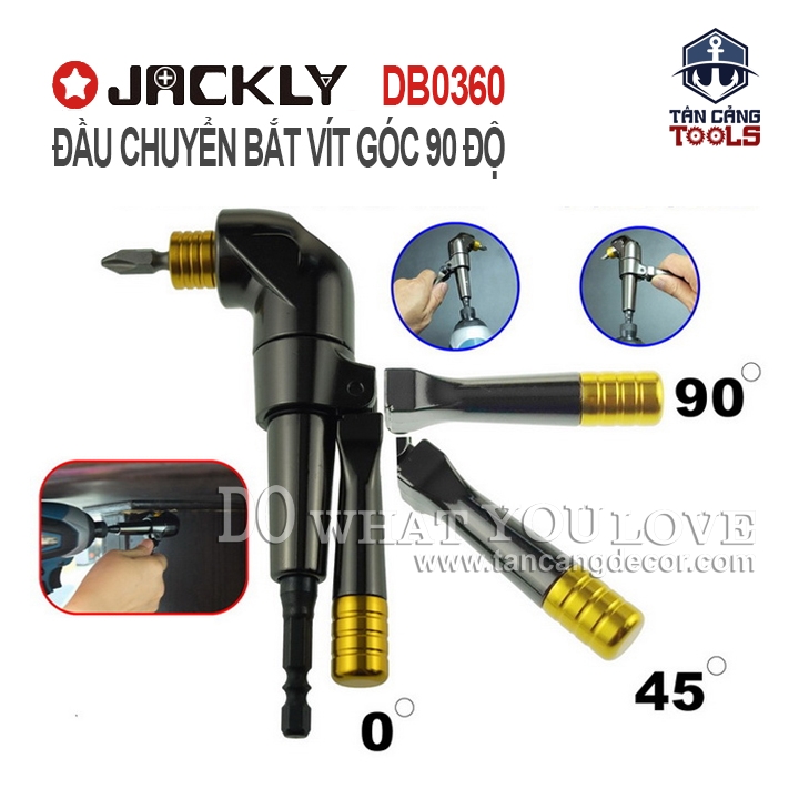 - Điểm đặc biệt của Combo Đầu Chuyển Bắn Vít Góc Jackly DB0360 đó chính là tay cầm có thể xoay các góc 0 – 45 – 90 độ giúp thao tác dễ dàng khi sử dụng và gấp gọn bảo quản.Ngoài ra, với thiết kế cải tiến mới hệ chuôi đặc biệt , sử dụng như chuôi ngắn và chuôi dài, có thể dùng cho mọi dòng máy bắt vít pin.