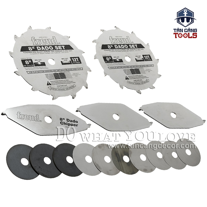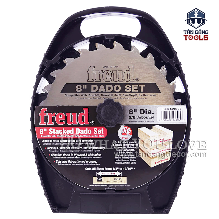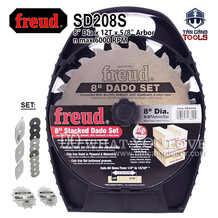 Combo Lưỡi Dado 20.32 x 16 mm Freud SD208S với trọng lượng lớn, được cấu tạo từ hợp kim cứng chịu mài mòn đa góc đem lại hiệu quả công việc cao cưa mịn phôi ván.