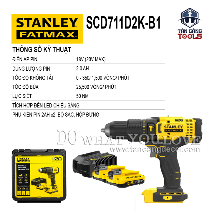 THÔNG TIN SẢN PHẨM: Xuất Xứ : Trung Quốc Sản Xuất Theo Tiêu Chuẩn Mỹ Thương Hiệu : STANLEY Dòng sản phẩm : STANLEY FATMAX Mã Sản Phẩm : SCD711D2K-B1 Sử Dụng Động Cơ Có Chổi Than Trọng Lượng : 1.2 Kg Tốc Độ Không Tải : 0 – 350 / 1.500 Vòng / Phút. Tốc Độ Búa : 25.500 Lần / Phút. Lực Vặn Tối Đa : 50N.m. Đầu Kẹp Auto Lock 13 Mm. Gồm 15 Cấp Độ Trượt Bắt Vít , Khoan, Khoan Búa. Sử Dụng Điện Áp 18V ( 20V Max ). Có Đèn Led. Thân Pin Hiển Thị Dung Lượng Pin. Công Nghệ Pin Mới : Mạch Xả Cao, Nội Trở Thấp. BỘ SẢN PHẨM BAO GỒM : + Thân Máy + Thùng Nhựa Cứng + 2 Pin 20V 2Ah + 1 Sạc 20V SC125 Sản Phẩm Bảo Hành Điện Tử 2 Năm Thân Máy – 1 Năm Cho Pin, Sạc