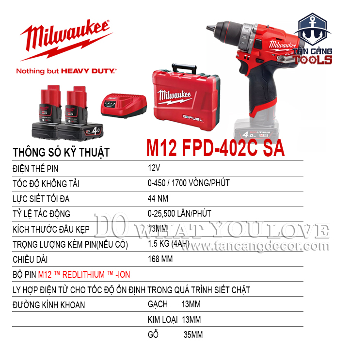THÔNG TIN SẢN PHẨM: Xuất Xứ : Trung Quốc Sản Xuất Theo Tiêu Chuẩn Mỹ Thương Hiệu : MILWAUKEE Hàng Chính Hãng https://www.milwaukeetool.asia/ Mã Sản Phẩm : FPD-402C Sử dụng động cơ không chổi than. Tay Cầm Bọc Su Mang Lại Cảm Giác Cầm Nắm Chắc Chắn. Điện Thế Pin : 12V Công Nghệ Pin Li-lon Tốc Độ Không Tải Cấp Độ 1 : 0-450 Vòng / Phút. Tốc Độ Không Tải Cấp Độ 2 : 0-1,700 Vòng / Phút. Đầu Kẹp Autolock Kim Loại :1.5- 13 mm Khả Năng Khoan Bê Tông : 13 mm Khả Năng Khoan Sắt : 13 mm Khả Năng Khoan Gỗ : 35 mm Tốc Độ Đập : 25,500 Lần / Phút. Lực Xoắn Tối Đa : 44 Nm. Trọng Lượng : 1.3 Kg Có Trang Bị Đèn Led Hiển Thị Pin. Đèn Led Làm Việc. Có 16 + 2 Cấp ( Khoan Búa, Khoan Thường ) 2 Cấp Tốc Độ. SẢN PHẨM BAO GỒM :( Đã Bao Gồm 2 Pin , Sạc ) + Thân Máy + Hộp Nhựa + 2 Pin 4.0 Ah. + Sạc 12V. Sản Phẩm Bảo Hành 12 Tháng.