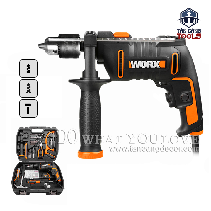 THÔNG TIN SẢN PHẨM: Xuất Xứ : Trung Quốc. Thương Hiệu : WORX Mã Hiệu : WX317.3 Chất Liệu : Thân máy làm bằng hợp kim nhôm và nhựa ABS tăng độ bền cho máy Có Điều Chỉnh Tốc Độ, Trang Bị Phím Giữ Công Tắc. Đầu kẹp mũi khoan: 1.5 – 13 mm Công suất : 600W Tốc độ không tải: 0 – 3000 vòng/phút Đường kính khoan gỗ: 25mm Đường kính khoan sắt: 13mm Đường kính khoan tường gạch: 16mm Máy có chế độ: ĐẢO CHIỀU Chiều dài dây điện : 2 mét Trọng lượng: 2.1 kg Bộ hộp số kim loại. Tay cầm chống trơn trượt. PHỤ KIỆN KÈM THEO: hộp nhựa , cây cử giới hạn độ sâu mũi khoan, phụ kiện mở khóa mũi khoan, tay cầm và 109 chi tiết Bảo hành: 6 Tháng