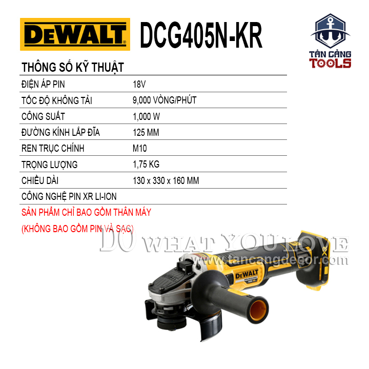 THÔNG TIN SẢN PHẨM: Xuất Xứ : Hàn Quốc. Thương Hiệu : DEWALT Mã Sản Phẩm : DCG405M1 Sử dụng động cơ không chổi than. Công Nghệ Pin XR Li-on. Trọng Lượng : 1.75 Kg Tốc Độ Không Tải : 0 – 9.000 Vòng / Phút. Công Suất : 1000 W. Kích Thước Thân Máy : 130 x 330 x 160 mm. Ren Trục Chính : M10 Sử Dụng Công Tắc Trượt – Hông. SẢN PHẨM BAO GỒM : + Túi Xách. + Thân Máy DCG405N + Nắp Chụp Bảo Vệ. + Tay Cầm + Vòng Đệm, Cờ Lê. + Pin 4.0 Ah DCB182 + Sạc DCB115 Thời Gian Sử Dụng Ước Lượng Với Pin 5.0 Ah Khoảng 25 Phút. Sản Phẩm Bảo Hành 3 Năm.