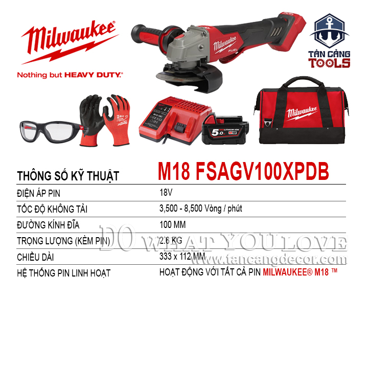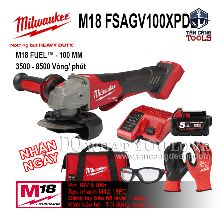 THÔNG TIN SẢN PHẨM: Xuất Xứ : Trung Quốc Sản Xuất Theo Tiêu Chuẩn Mỹ Thương Hiệu : MILWAUKEE Hàng Chính Hãng : https://www.milwaukeetool.asia/ Mã Hiệu : FSAGV100XPD Sử dụng động cơ không chổi than. Điện Thế Pin : 18V Công Nghệ Pin REDLITHIUM-ION™ Trọng Lượng : 2.6 Kg Tốc Độ Không Tải : 3.500 – 8.500 Vòng / Phút. Chiều Sâu Cắt Tối Đa : 19 mm. Kích Thước Thân Máy : 333 x 122 mm. Ren Trục Chính : M10 Sử Dụng Công Tắc Bóp. Công Tắc Khóa An Toàn. Trang Bị Hệ Thống Phanh Điện Tử 2s. Tính Năng REDLINK PLUSTM Chống Quá Tải. Sản Phẩm Bao Gồm : ( Chưa Bao Gồm Pin, Sạc ) BỘ COMBO KHUYẾN MÃI BAO GỒM : + Pin 18V 5.0 Ah + Sạc 12-18V FC + Găng Tay Bảo Hộ Level 1 Size L + Kính Bảo Hộ + Túi Xách + Thùng Nhựa Sản Phẩm Bảo Hành 12 Tháng. Số Lượng Có Hạn.