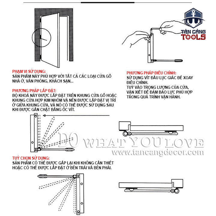 - Có thể điều chỉnh tốc độ đóng một cách đơn giản bằng cách thay đổi chiều lục giác.Tùy vào trọng lượng lượng cửa có thể điều chỉnh phù hợp nhất