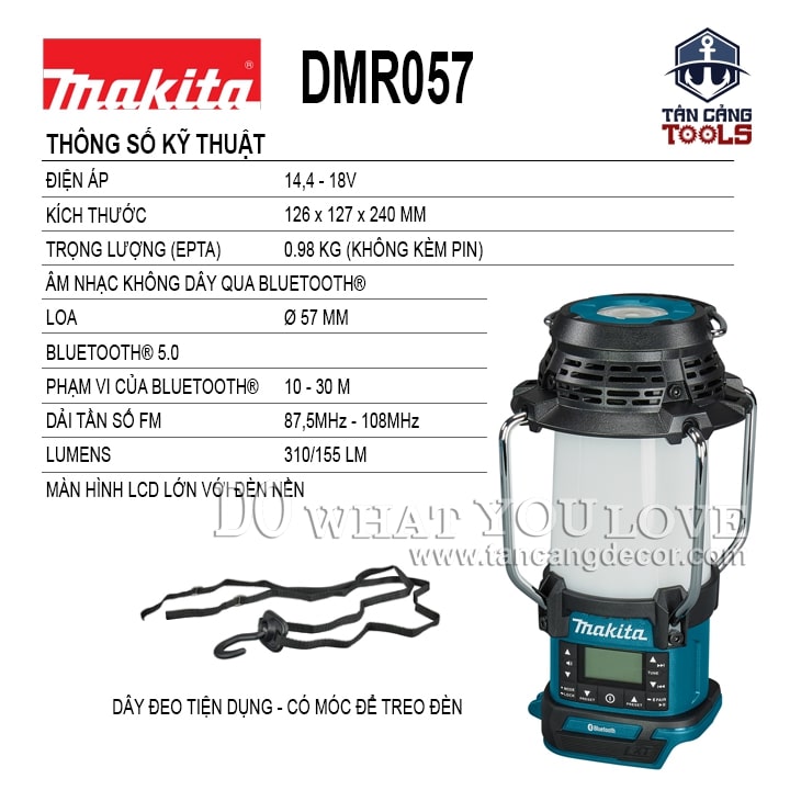 - Đèn Led Kết Hợp Radio Và Cổng Sạc Dùng Pin Makita 18V DMR057 được thiết kế để phục vụ các nhu cầu giải trí và làm việc trong môi trường xây dựng hoặc cắt cắt, gọt gẻ, mài mòn các loại vật liệu, nơi không có nguồn điện. Radio có khả năng nhận sóng FM/AM, cho phép người dùng lựa chọn kênh yêu thích để thưởng thức âm nhạc hoặc nghe tin tức trong quá trình làm việc.