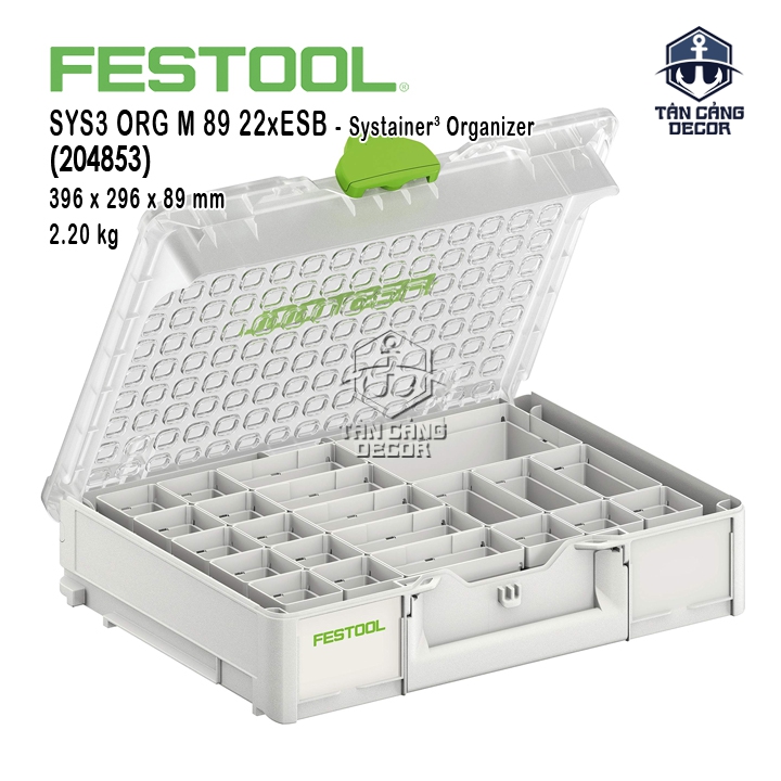 - Hộp Đựng Dụng Cụ Festool Systainer³ SYS3 ORG M 89 22xESB (204853) là một sản phẩm thuộc hệ thống Systainer³ của Festool, chuyên dùng để tổ chức và lưu trữ các vật dụng nhỏ trong các ngành nghề như gia công, sửa chữa hoặc xây dựng.