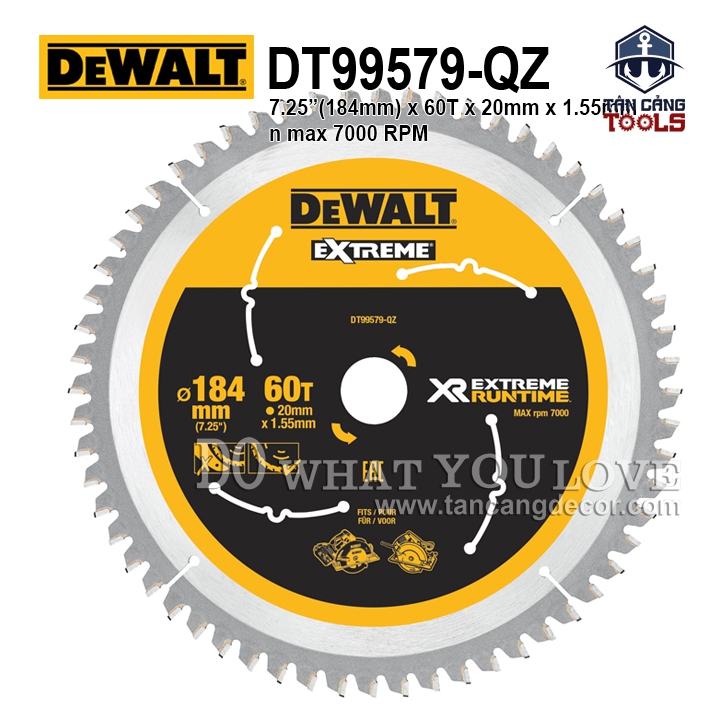 - Lưỡi Cưa Gỗ Hợp Kim 184 x 20 mm x 60 T DeWalt DT99579-QZ ( Extreme Runtime ) với trọng lượng nhẹ, được cấu tạo từ hợp kim cứng chịu mài mòn đa góc đem lại hiệu quả công việc cao cưa mịn và xẻ phôi ván.