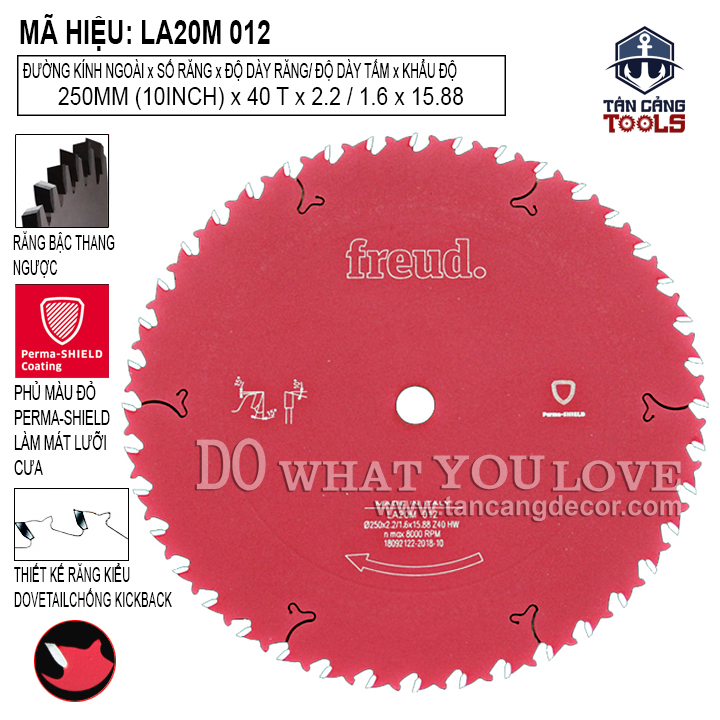 Thương Hiệu : FREUD Mã Hiệu : LA20M 012 Xuất Xứ : Sản Xuất Italy Chất Liệu : Thép Hợp Kim – Hàn Hợp Kim Cho Độ Ổn Định Cao. Màu Sắc : Màu Đỏ. Độ dày : Đĩa Cưa 1.6 mm – Lưỡi Cưa 2.2 mm Kích Thước : 10 inches ( 254 Mm ) Số Răng : 40 T Cốt Lưỡi : 16 mm Dạng Lưỡi : Răng Bậc Thang Ngược – Dovetail Chống Kickback. Được Phủ Lớp Teflon Chống Bám Dính Cao. Sử Dụng Thích Hợp Với Các Dòng Máy Cabinet : Harvey, Nototec, Hisimen… Vòng Tua Tối Đa 8000 Vòng / Phút. Đơn Giá Bán 1 Lưỡi. Bạn Có Thể Tham Khảo Thêm Các Dòng Lưỡi Cắt Gỗ, Nhôm Với Các Kích Thước Khác Tại Tân Cảng Decor ^^