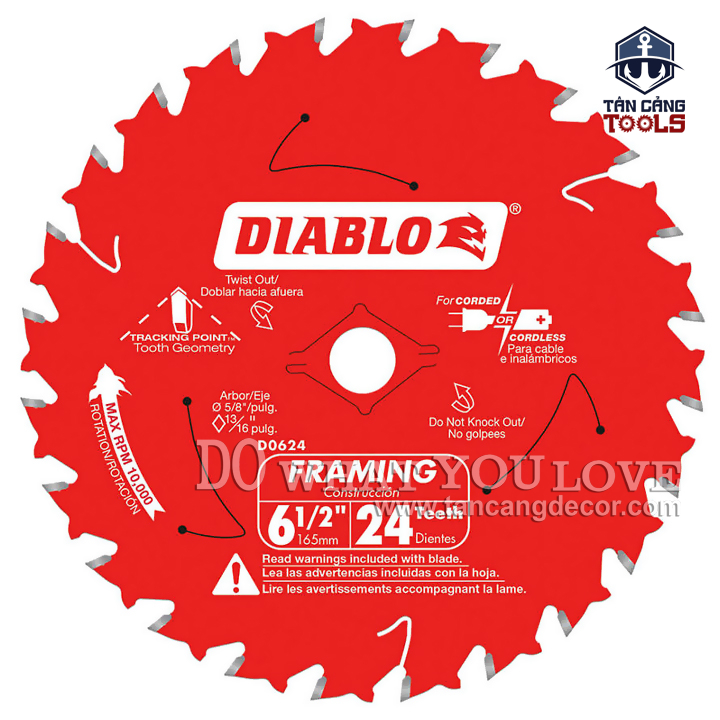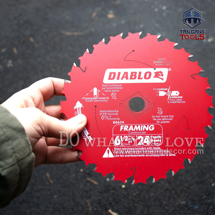 Lưỡi Cưa Gỗ Hợp Kim Diablo 165 x 16 mm x 24T Freud D0624 với trọng lượng nhẹ, được cấu tạo từ hợp kim cứng chịu mài mòn đa góc đem lại hiệu quả công việc cao cưa mịn và xẻ phôi ván.
