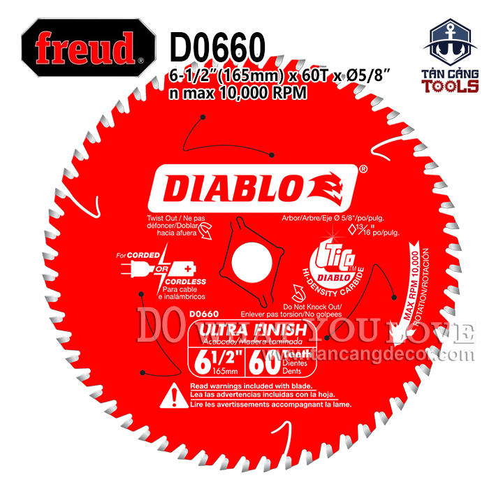 Lưỡi Cưa Gỗ Hợp Kim Diablo 165 x 16 mm x 60T Freud D0660 với trọng lượng nhẹ, được cấu tạo từ hợp kim cứng chịu mài mòn đa góc đem lại hiệu quả công việc cao cưa mịn và xẻ phôi ván.