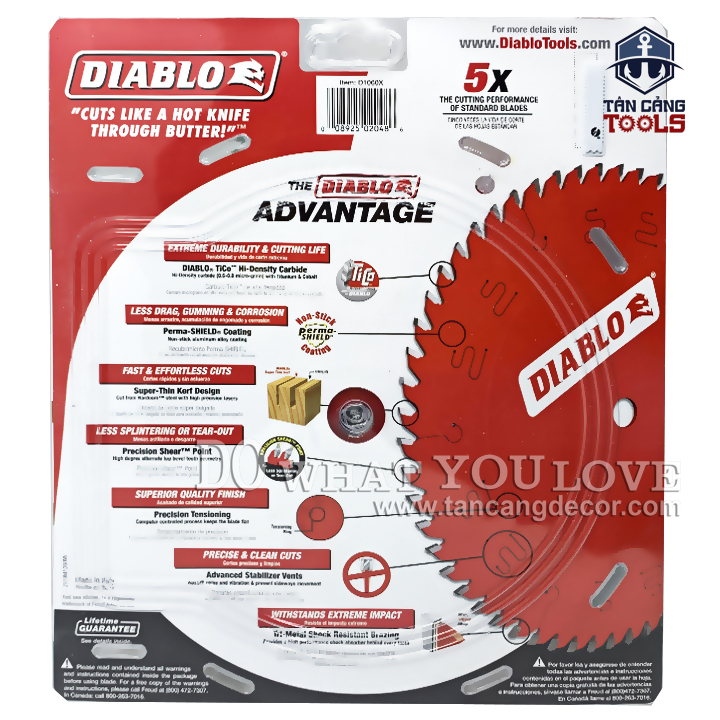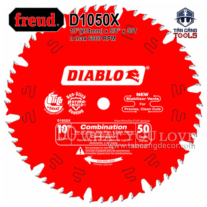 Lưỡi Cưa Gỗ Hợp Kim Diablo 250 x 16 mm x 50T Freud D1050X với trọng lượng nhẹ, được cấu tạo từ hợp kim cứng chịu mài mòn đa góc đem lại hiệu quả công việc cao cưa mịn và xẻ phôi ván.