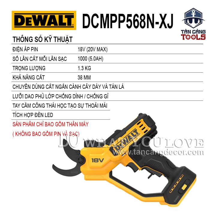 THÔNG TIN SẢN PHẨM: Xuất Xứ : Trung Quốc. Thương Hiệu : DEWALT – HÀNG CHÍNH HÃNG Mã Hiệu : DCMPP568N Chất Liệu : Thân máy cấu tạo nhựa ABS tăng độ bền cho máy, cách điện kép. Trọng Lượng : 1.3 Kg Sử Dụng Động Cơ Không Chổi Than. Điện Thế Pin : 18V/20V Max Công Nghệ Pin XR Li-lon Khả Năng Cắt : 38 mm Số Lần Cắt Mỗi Lần Sạc Trên Pin 5.0 : 1000 Lần Tay Cầm Thiết Kế Dạng Công Thái Học. Lưỡi Dao Phủ Chống Dính Có Đèn Led. Trang Bị Lẫy Khóa BỘ SẢN PHẨM BAO GỒM : + Hộp Giấy + Thân Máy DCMPP568N Sản phẩm bảo hành 3 Năm Toàn Quốc.