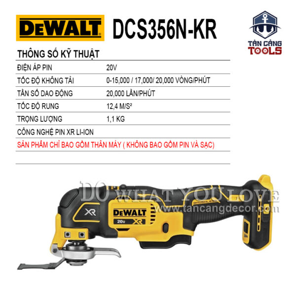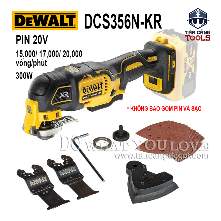 THÔNG TIN SẢN PHẨM: Xuất Xứ : Trung Quốc Thương Hiệu : DEWALT – HÀNG CHÍNH HÃNG Mã Sản Phẩm : DCS356N Sử dụng động cơ không chổi than. Công Nghệ Pin XR Li-on. Trọng Lượng : 1.68 Kg Tốc Độ Không Tải : 0 – 15.000 / 17.000 / 20.000 Vòng / Phút. Trang Bị 3 Cấp Điều Tốc. Công Suất : 300 W. Kích Thước : 310 mm. Độ Rụng : 16.1 M / S2 Biên Độ Rung : Trái/Phải 1.5 Độ. Độ Ồn : 86 DB Có Đèn Led. SẢN PHẨM BAO GỒM :( Chưa Bao Gồm Pin, Sạc ) + Hộp Giấy. + Thân Máy DCS356N + 2 Lưỡi Cắt Rụng. + Đế Tam Giác Gắn Giấy Nhám. + 20 Tờ Giấy Nhám Đi Kèm. + Lục Giác, Chụp Khóa Sài Lưỡi Liền. Sản Phẩm Bảo Hành 3 Năm.