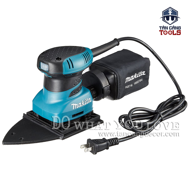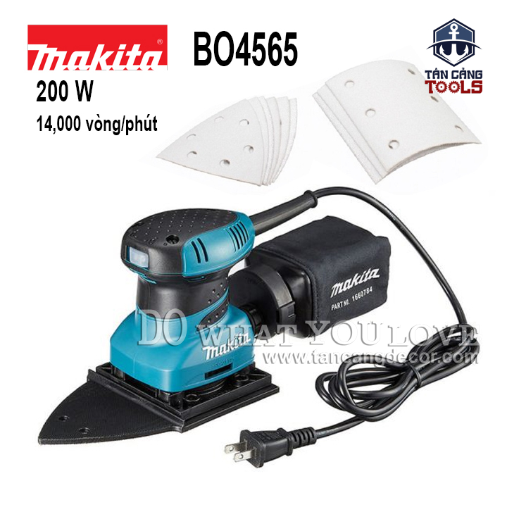 THÔNG TIN SẢN PHẨM: Xuất Xứ : Trung Quốc. Thương Hiệu : MAKITA – HÀNG CHÍNH HÃNG Mã Hiệu : BO4565 Chất Liệu : Thân máy cấu tạo nhựa ABS tăng độ bền cho máy, cách điện kép. Công suất : 200W Sử dụng điện: : 220V – 240V/50Hz – 60Hz Chiều dài dây : 2 mét Tốc độ không tải : 14.000 vòng/phút Kích Thước Đế : 112 x 190 mm. Kích Thước Giấy Nhám : Tam Giác 96 x 96 mm – Hình Vuông 114 x 102 mm Trọng lượng : 1.1 kg Phụ kiện kèm theo: túi bụi, 6 miếng giấy nhám Bảo hành: 6 Tháng.