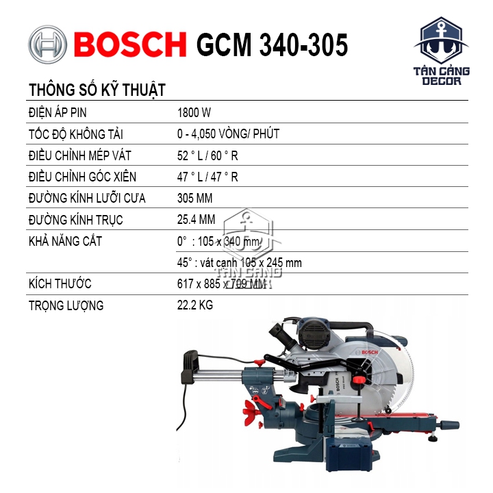 Máy cưa cắt đa góc trục trượt BOSCH GCM 340 305D chuyên dùng để cắt gỗ, nhôm và vật liệu xây dựng ở nhiều góc độ. Ứng dụng trong ngành mộc, nội thất, thi công công trình, xưởng cơ khí và DIY.
