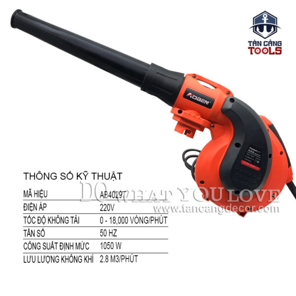 THÔNG TIN SẢN PHẨM: Xuất Xứ : Trung Quốc. Thương Hiệu : AOBEN – HÀNG CHÍNH HÃNG Mã Hiệu : AB4028T Chất Liệu : Thân máy cấu tạo nhựa mô tơ lõi đồng. Động Cơ Chổi Than. Công suất : 1050W Sử dụng điện: : 220V – 240V/50Hz – 60Hz Chiều dài dây : 1.6 mét Tốc độ không tải : 18.000 vòng/phút Điều Tốc Dạng Dimmer. Kích Thước : 220 x 400 mm Thể tích khí : 2,8 m3/ giây. Cơ Chế Hút Bụi Bằng Cách Xoay Đầu Ống Tiện Lợi. Trọng lượng : 2.4 kg BỘ SẢN PHẨM ĐI KÈM : Túi Thu Bụi, Ống Hút Thổi, Dây Ống Hút, Đầu Hút Chữ T. Sản Phẩm Bảo hành: 3 Tháng