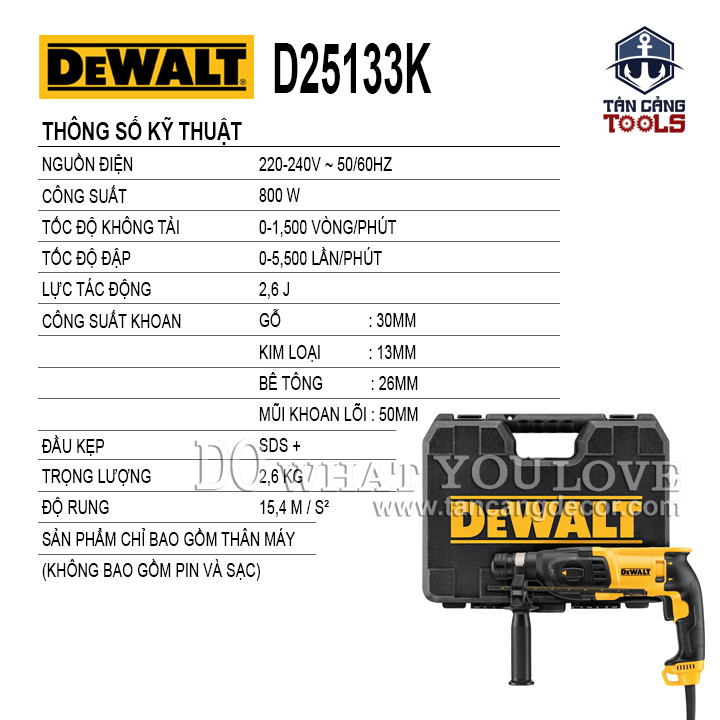 - Máy Khoan Bê Tông 3 Chế Độ DeWalt D25133K 800W có thể khoan được nhiều loại vật liệu cứng như kim loại, tường, bê tông, được sử dụng rộng rãi ở rất nhiều công trường xây dựng, xưởng gỗ, xưởng cơ khí