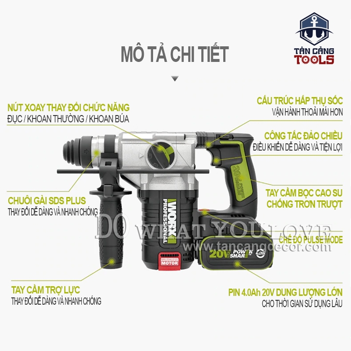 Nâng cấp thêm chế độ Pulse Mode : áp dụng khi khoan gạch , men không cần thay mũi khoan – xoay chậm mũi để tránh vỡ gạch trong giai đoạn đầu bóp cò – khi ổn định sẽ chuyển sang chế độ khoan búa.