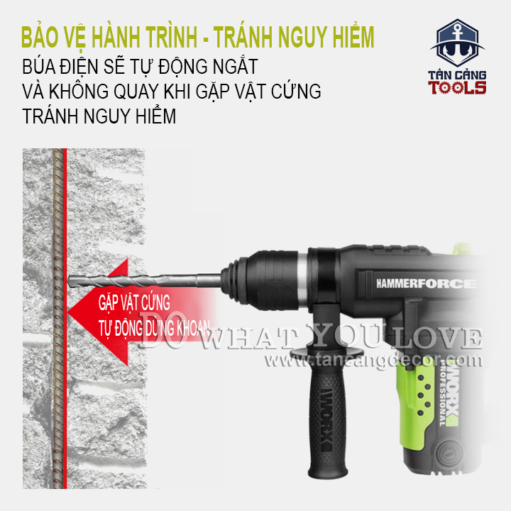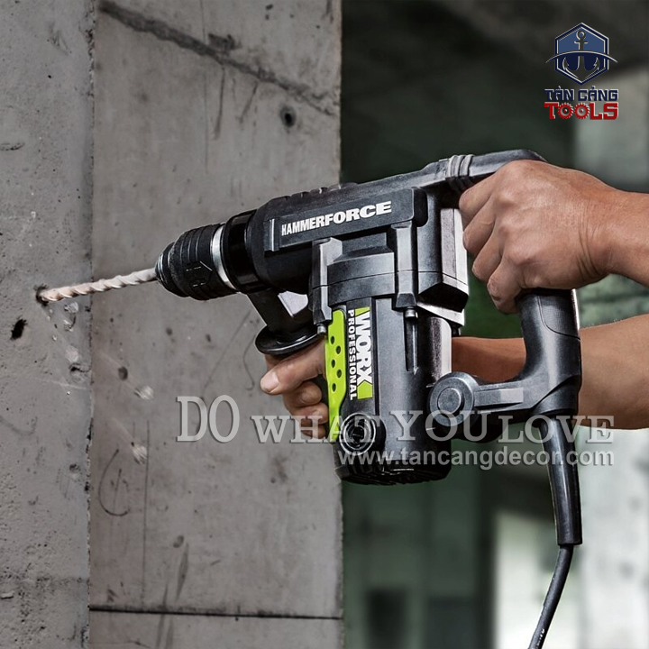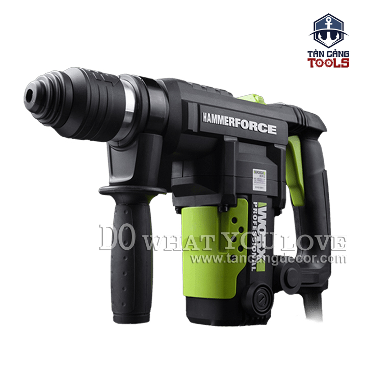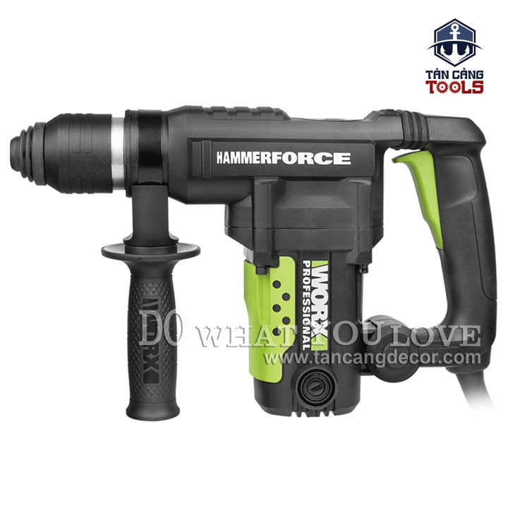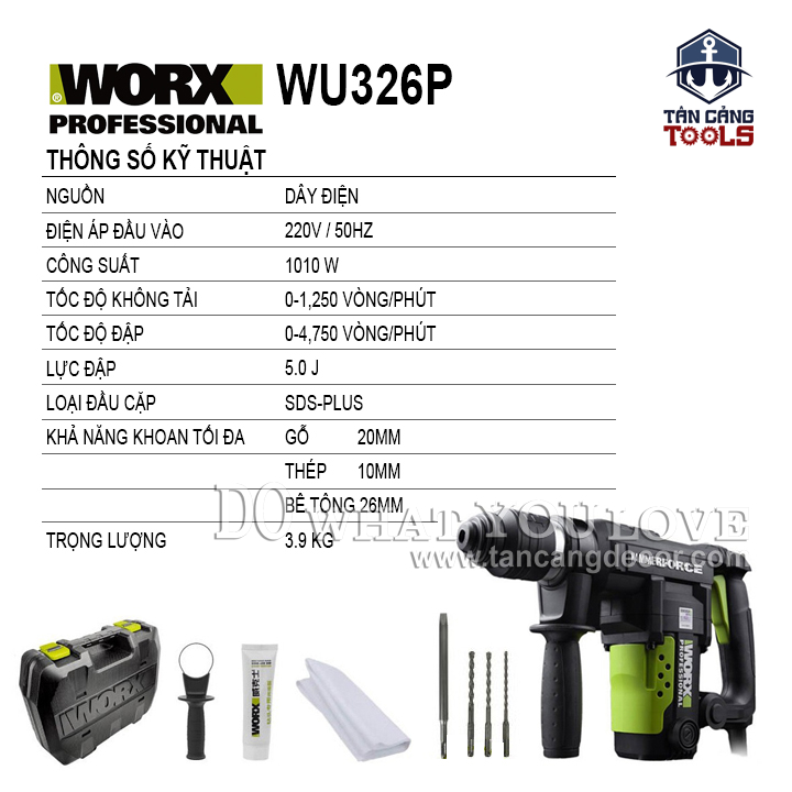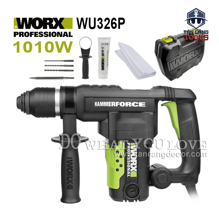 THÔNG TIN SẢN PHẨM: Xuất Xứ : Trung Quốc Sản Xuất Theo Tiêu Chuẩn Mỹ Thương Hiệu : WORX Hàng Chính Hãng https://www.worx.com Mã Sản Phẩm : WU326P Chất Liệu Thân Máy Được Làm Từ Nhựa Cứng Tổng Hợp. Trọng Lượng Máy : 3.9 Kg. Sử Dụng Điện Áp Sạc 220 V. 100% Roto Bằng Đồng Nguyên Chất. Công Suất : 1010 W. Tốc Độ Không Tải : 0 – 1250 Vòng / Phút. Tốc Độ Đập : 0 – 4750 Lần / Phút. Lực Đập : 5.0 J Kích Thước : 42.5 x 29.5 x 14.8 cm. Sử Dụng Đầu Nhét SDS PLUS. Có 3 Chế Độ : Đục, Khoan , Khoan Búa. Khả năng khoan tối đa : + Gỗ: 20 mm + Thép: 10 mm + Bê tông: 26 mm BỘ SẢN PHẨM BAO GỒM: + Tay cầm phụ + 3 mũi khoan SDS-Plus 6/8/10mm + 1 mũi đục. + Mỡ bôi trơn đầu cặp + Vali nhựa chắc chắn Sản phẩm bảo hành 12 Tháng.