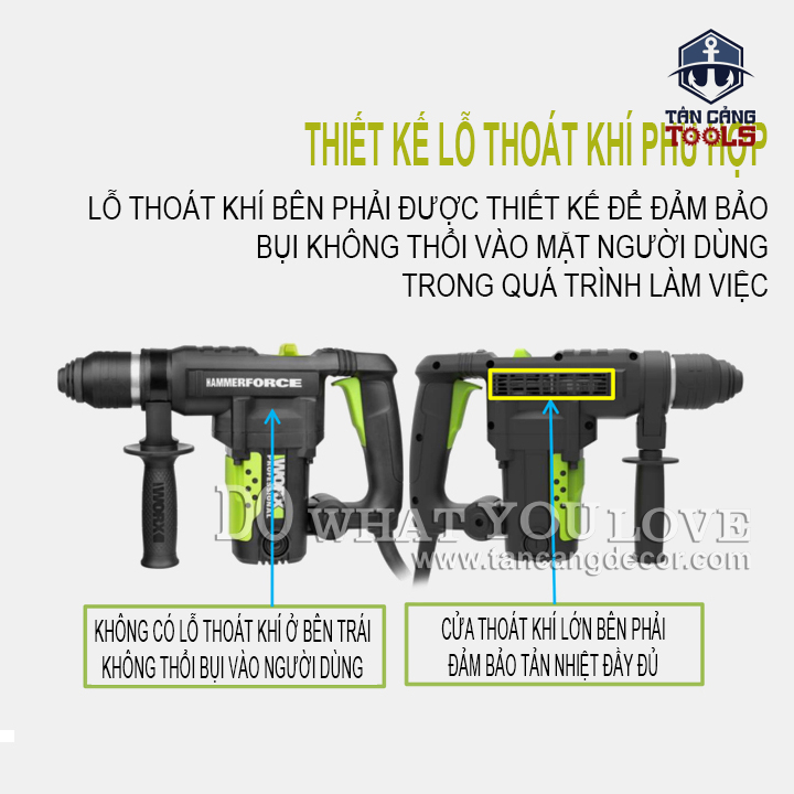 Đặc biệt lỗ thoát khí lớn nằm bên phải hạn chế lực khí thổi vào người khi vận hành.