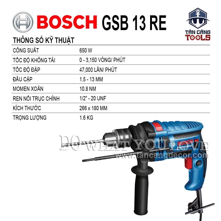 - Máy Khoan Động Lực Bosch GSB 13RE 650W ( Hộp Giấy ) là một loại máy khoan hoạt động mạnh mẽ với các thiết kế ưu việt được tích hợp cùng máy giúp máy sở hữu các yếu tố của một thiết bị khoan chuyên nghiệp nhưng với trọng lượng vừa phải đủ để thực hiện các công việc sửa chữa lắp đặt trong gia đình.