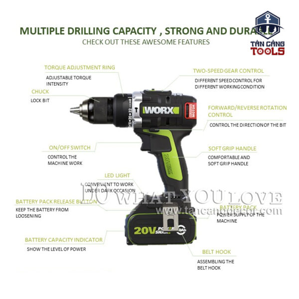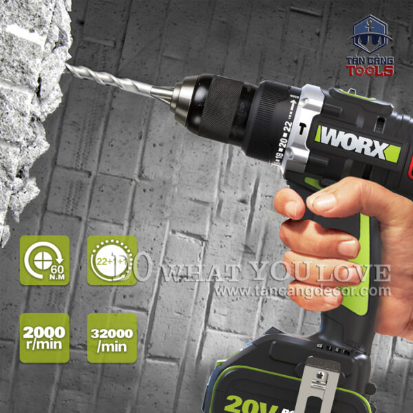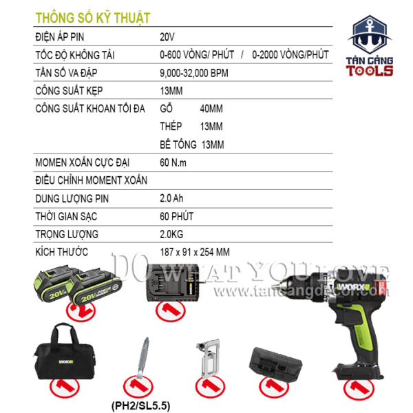 THÔNG TIN SẢN PHẨM: Xuất Xứ : Trung Quốc Sản Xuất Theo Tiêu Chuẩn Mỹ Thương Hiệu : WORX Hàng Chính Hãng https://www.worx.com Mã Sản Phẩm : WU189.2 Sử dụng động cơ không chổi than. Trọng Lượng : 2.0 Kg Tốc Độ Đập Búa : 9.000 – 32.000 Lần / Phút Vòng Tua : Cấp 1 0 – 600 ; Cấp 2 0 – 2000 vòng/phút. Thời Gian Sạc Đầy 60 Phút. Có 22 Cấp Trượt Bắt Vít , Khoan Thường, Khoan Có Búa. Khả Năng Làm Việc : + Khoan Gỗ : 40 mm + Khoan Bê Tông : 13 mm + Khoan Kim Loại : 13 mm Đầu Kẹp Kim Loại 13 mm Có Đèn Pin. BỘ SẢN PHẨM BAO GỒM : + Thân Máy + Túi Xách + 2 Pin 20V 2AH – WA3593 Có Chế Độ Báo Pin. + 1 Sạc 20V + Móc Đeo + Nắp Nhựa Gắn Đầu Vít Ngắn 2 Đầu Đi Kèm. Sản Phẩm Bảo Hành Điện Tử 12 Tháng Từ Weldcom.