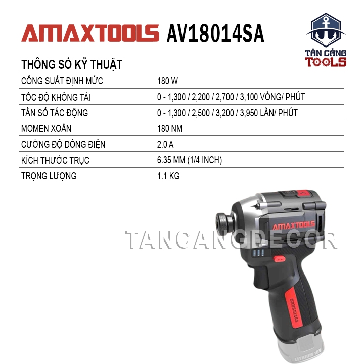 - Amaxtools AV18014SA được trang bị nhiều tính năng hữu ích nhằm hỗ trợ tối đa cho người dùng, bao gồm: tạo xung, dùng trên vật liệu mỏng, mồi vít, chống gãy vít, auto stop.