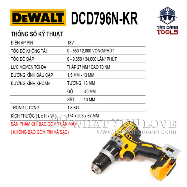 THÔNG TIN SẢN PHẨM: Xuất Xứ : Trung Quốc. Thương Hiệu : DEWALT– HÀNG CHÍNH HÃNG Mã Hiệu : DCD796N Chất Liệu : Thân máy cấu tạo nhựa ABS tăng độ bền cho máy, cách điện kép. Trọng Lượng : 1.8 Kg Sử Dụng Động Cơ Không Chổi Than. Điện Thế Pin : 18V Công Nghệ Pin XR Li-lon Công suất : 460W Tốc Độ Không Tải : 0 -550 / 2.000 Vòng / Phút. Tốc Độ Đập : 0 – 9.350 / 34.000 Lần / Phút. Momen Xoắn : Thấp 27 / Cao 70 Nm. Đầu Kẹp Kim Loại 13mm. Có 13 Cấp Trượt Bắt Vít , Khoan Thường, Khoan Búa. Có Đèn Led. Khả Năng Khoan : + Gỗ : 40 mm + Kim Loại : 13 mm + Tường : 13 mm BỘ SẢN PHẨM BAO GỒM : + Hộp Giấy + Thân Máy DCD796N + Móc Gài. Sản phẩm bảo hành 3 Năm Toàn Quốc.