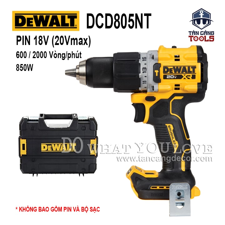 THÔNG TIN SẢN PHẨM: Xuất Xứ : Trung Quốc. Thương Hiệu : DEWALT – HÀNG CHÍNH HÃNG Mã Hiệu : DCD805NT Chất Liệu : Thân máy cấu tạo nhựa ABS tăng độ bền cho máy, cách điện kép. Trọng Lượng : 1.3 Kg Sử Dụng Động Cơ Không Chổi Than. Điện Thế Pin : 18V (20V Max ) Tốc Độ Không Tải : 0 -600 / 2.000 Vòng / Phút. Tốc Độ Đập : 35.000 Lần / Phút. Công Suất : 850 W. Momen Xoắn : 90 Nm. Đầu Kẹp Kim Loại 13mm. Có 15 Cấp Trượt Bắt Vít , Khoan Thường, Khoa Búa. Có Đèn Led Xoay Và Chỉnh Cường Độ Khả Năng Khoan : + Gỗ : 55 mm + Kim Loại : 13 mm BỘ SẢN PHẨM BAO GỒM :( Chưa Bao Gồm Pin, Sạc ) + Hộp Nhựa + Thân Máy DCD805NT + Móc Gài. Sản phẩm bảo hành 3 Năm Toàn Quốc.