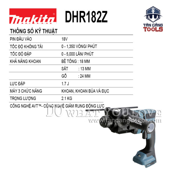THÔNG TIN SẢN PHẨM: Xuất Xứ : Trung Quốc. Thương Hiệu : MAKITA – HÀNG CHÍNH HÃNG Mã Hiệu : DHR182Z Chất Liệu : Thân máy cấu tạo nhựa ABS tăng độ bền cho máy, cách điện kép. Trọng Lượng : 2.1 Kg Sử Dụng Động Cơ Không Chổi Than. Điện Thế Pin : 18V Tốc Độ Không Tải : 0 – 1.300 Vòng / Phút. Tốc Độ Đập : 0 – 5.000 Lần / Phút. Lực Đập : 1.7 J. Có 3 Chức Năng : Khoan Thường, Khoan Búa , Đục. Kích Thước : 301 x 82 x 285 mm. Trang Bị Công Nghệ AVT – Giảm Rung Động Lực. Có Đèn Led Chiếu Sáng. Khả Năng Khoan : + Gỗ : 24 mm + Kim Loại : 13 mm + Bê Tông : 18 mm BỘ SẢN PHẨM BAO GỒM : + Hộp Giấy + Thân Máy + Tay Cầm + Cử Thước. Sản phẩm bảo hành 6 Tháng.