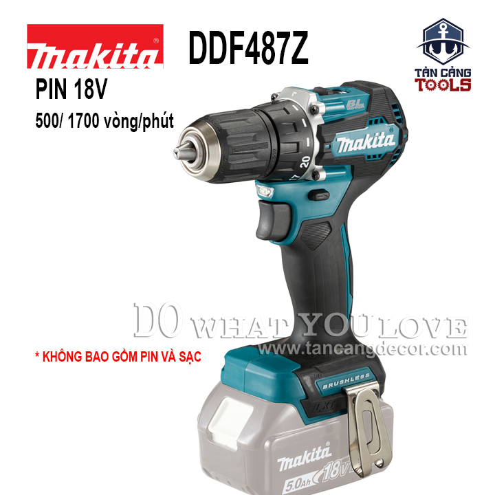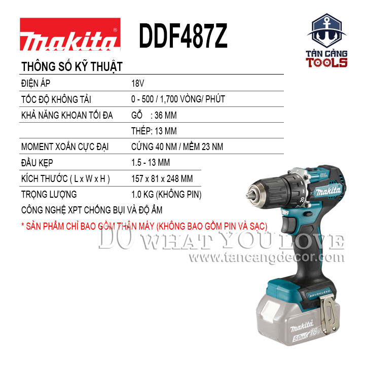 THÔNG TIN SẢN PHẨM: Xuất Xứ : Trung Quốc. Thương Hiệu : MAKITA – HÀNG CHÍNH HÃNG Mã Hiệu : DDF487Z Chất Liệu : Thân máy cấu tạo nhựa ABS tăng độ bền cho máy, cách điện kép. Trọng Lượng : 1.0 Kg Sử Dụng Động Cơ Không Chổi Than. Điện Thế Pin : 18V Công Nghệ Pin XR Li-lon Tốc Độ Không Tải : 0 -500 / 1.700 Vòng / Phút. Lực Vặn Tối Đa : 40 Nm. Lực Vặn Tối Thiểu : 23 Nm. Công Suất : 280 W. Đầu Kẹp Kim Loại 13mm. Kích Thước : 157 x 81 x 248 mm. Có 20 Cấp Trượt Bắt Vít , Khoan Thường. Có Đèn Led. Trang Bị Công Nghệ XPT : Chống Bụi , Chống Ẩm. Khả Năng Khoan : + Gỗ : 36 mm + Kim Loại : 13 mm BỘ SẢN PHẨM BAO GỒM : + Hộp Giấy + Thân Máy + Móc Gài. Sản phẩm bảo hành 6 Tháng.