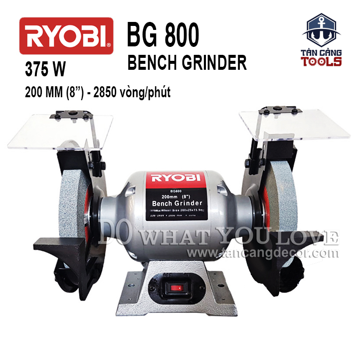 THÔNG TIN SẢN PHẨM: Xuất Xứ : Trung Quốc. Thương Hiệu : RYOBI – HÀNG CHÍNH HÃNG Mã Hiệu : BG800 Chất Liệu : Gang Đúc Nguyên Khối – Hợp Kim Nhôm. Công suất : 375W Sử dụng điện: : 220V Tốc độ không tải : 2.580 vòng/phút Sử dụng lưỡi : 200 x 25 mm Đường kính lỗ : 15.9 mm Trọng Lượng : 14 kg Trang Bị 2 Đá Mài : 1 Đá Mài Thô – 1 Đá Mài Mịn. PHỤ KIỆN KÈM THEO : nắp bảo vệ, thân máy. Bảo Hành Chính Hãng 12 Tháng.