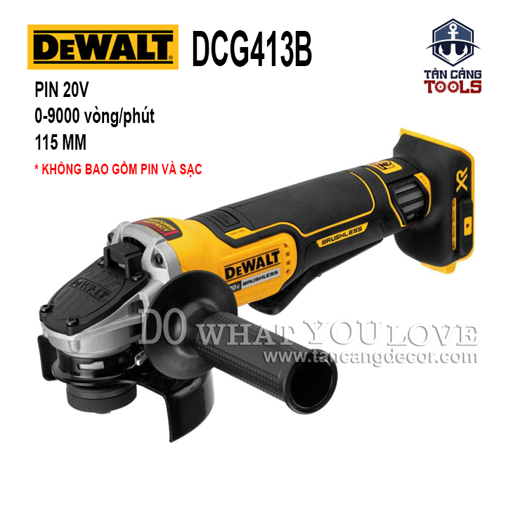 THÔNG TIN SẢN PHẨM: Xuất Xứ : Trung Quốc. Thương Hiệu : DEWALT – HÀNG CHÍNH HÃNG Mã Sản Phẩm : DCG413B Sử dụng động cơ không chổi than. Công Nghệ Pin 20V XR Li-on. Trọng Lượng : 1.7 Kg Tốc Độ Không Tải : 0 – 9.000 Vòng / Phút. Công Suất : 800 W. Kích Thước Thân Máy : 127 x 330 x 152 mm. Ren Trục Chính : M14 Sử Dụng Công Tắc Bóp. Trang Bị Hệ Thống Phanh Điện Tử 2s. Tính Năng E-SWITCH PROTECTION – Chống Khởi Động Lại. SẢN PHẨM BAO GỒM :( Chưa Bao Gồm Pin, Sạc ) + Hộp Giấy. + Thân Máy DCG413B + Nắp Chụp Bảo Vệ. + Tay Cầm + Vòng Đệm, Cờ Lê. Thời Gian Sử Dụng Ước Lượng Với Pin 5.0 Ah Khoảng 25 Phút. Sản Phẩm Bảo Hành 3 Năm.