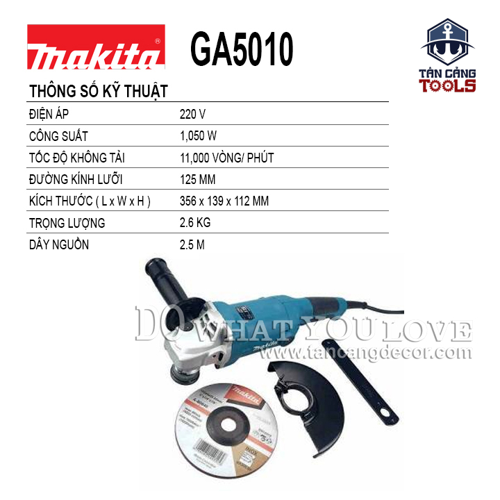 THÔNG TIN SẢN PHẨM: Xuất Xứ : Trung Quốc Thương Hiệu : MAKITA – HÀNG CHÍNH HÃNG Mã Hiệu : GA5010 Chất Liệu : Thân máy cấu tạo nhựa ABS tăng độ bền cho máy, cách điện kép. Công suất : 1050W Sử dụng điện: : 220V Chiều dài dây : 2.5 mét Tốc độ không tải : 11.000 vòng/phút Sử dụng lưỡi : 125mm Đường kính lỗ : 22 mm Kích Thước : 356 x 139 x 112 mm. Sử dụng công tắc bóp phần giữa máy. Trọng Lượng : 2.6 kg Phụ kiện kèm theo: nắp bảo vệ, dụng cụ mở lưỡi, tay cầm, đá mài 125 mm Bảo Hành Chính Hãng 6 Tháng.