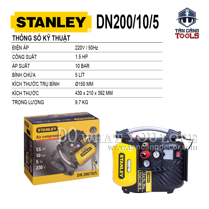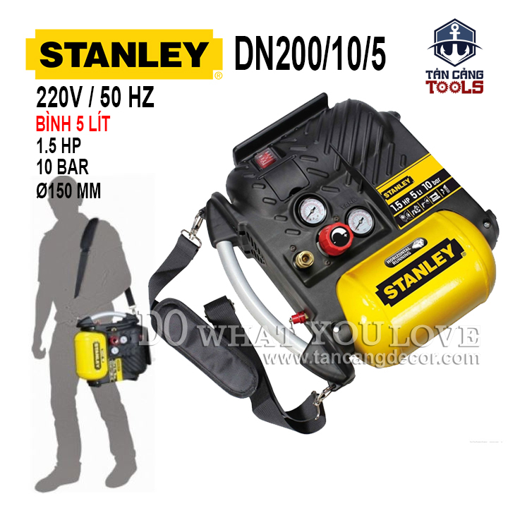THÔNG TIN SẢN PHẨM: Xuất Xứ : Trung Quốc Thương Hiệu : STANLEY – HÀNG CHÍNH HÃNG Mã Hiệu : DN200/10/5 Chất Liệu : Thân máy cấu tạo nhựa ABS tăng độ bền cho máy, Thùng Máy Thép Dày Công Nghệ Giảm Âm Công Suất : 1.5 HP Điện Áp : 220 V Lưu Lượng Khí : 105 Lít / Phút Áp Lực : 10 Bar Dung Tích : 5 Lít Kích Thước Trụ Bình : Ø150mm Kích Thước Máy : 430 x 210 x 292 mm Trọng Lượng : 9.7 Kg Sử Dụng Động Cơ Không Dầu. Bảo hành 6 Tháng Toàn Quốc.