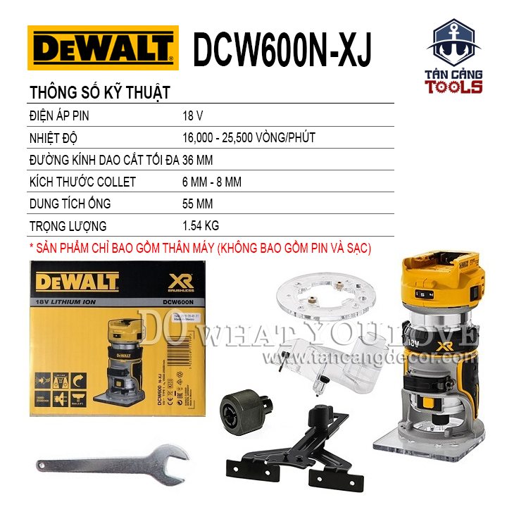 THÔNG TIN SẢN PHẨM: Xuất Xứ : Trung Quốc. Thương Hiệu : DEWALT – HÀNG CHÍNH HÃNG Mã Hiệu : DCW600N Chất Liệu : Thân máy cấu tạo nhựa ABS tăng độ bền cho máy, cách điện kép. Sử Dụng Động Cơ Không Chổi Than. Điện Thế Pin : 18V Công Nghệ Pin Li-lon Sử Dụng Đầu Kẹp : 6.35 mm – 8 mm Tốc Động Không Tải : 16.000 – 25.500 Vòng / Phút. Có 7 Cấp Độ. Đường Kính Ống Hút 55 mm. Trang Bị Phanh Thắng Tuyến Tính Nhanh Chóng. Trọng Lượng : 1.54 Kg. SẢN PHẨM BAO GỒM : ( Chưa Pin, Sạc ) + Hộp Giấy. + Thân Máy + Cốc Phay. + Nắp Ống Thu Bụi. + Cử Đẩy Thẳng. + Cờ Lê. + Cử Tròn Mica. + Cốt Kẹp Mũi 8 mm. + Cốt Kẹp Mũi 6.35 mm. Sản Phẩm Bảo Hành 3 Năm.