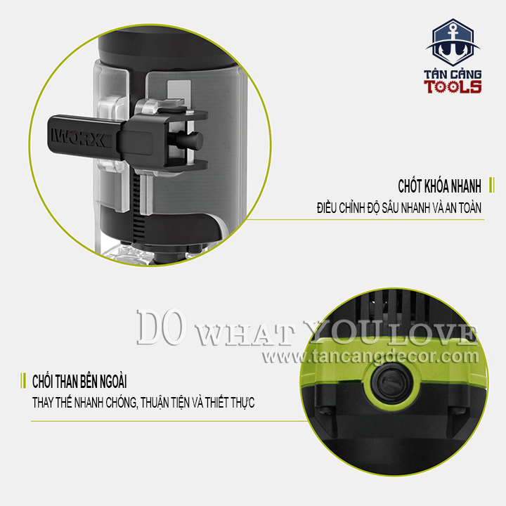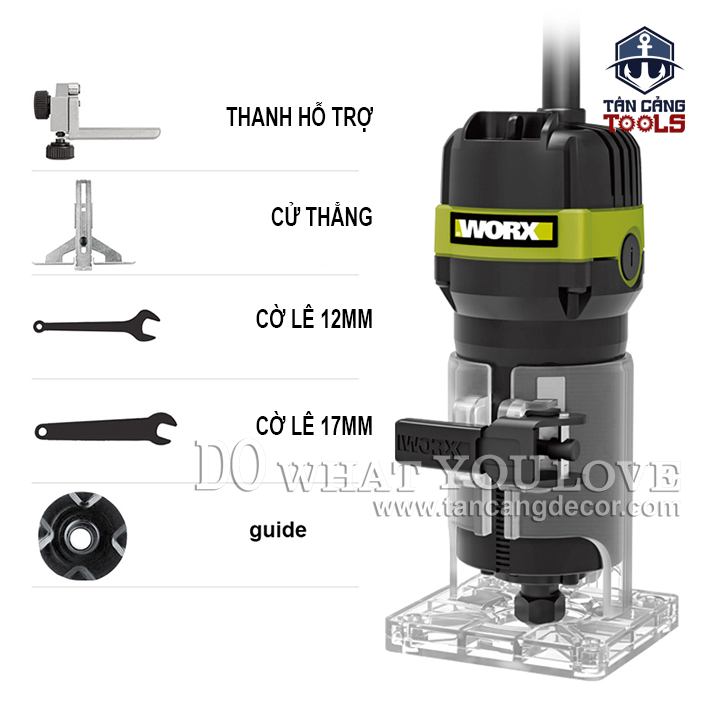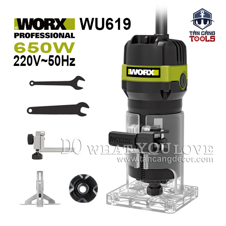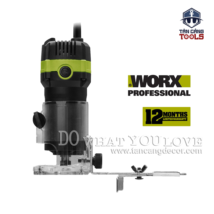 THÔNG TIN SẢN PHẨM: Xuất Xứ : Trung Quốc Sản Xuất Theo Tiêu Chuẩn Mỹ Thương Hiệu : WORX Hàng Chính Hãng https://www.worx.com Mã Sản Phẩm : WU619 Sử dụng động cơ có chổi than. Trọng Lượng : 1.5 Kg Công Suất : 650 W. Moto Lõi Đồng – Khe Thoát Nhiệt Lớn. Tốc Độ Không Tải : 0 – 30.000 Vòng / Phút. Đầu Kẹp 1/4 Inches ( 6.35 mm ). Sử Dụng Nguồn Điện 220 V – 50Hz. Kích Thước : 122 x 90 x 202 mm Có Chế Độ Điều Tốc. BỘ SẢN PHẨM BAO GỒM: + Thanh đo độ sâu + Thanh dẫn thẳng + Cờ lê 12 + Cờ lê 17 + Khuôn dẫn + Tấm chắn chống bụi. Sản Phẩm Bảo Hành Điện Tử 12 Tháng Từ Weldcom.