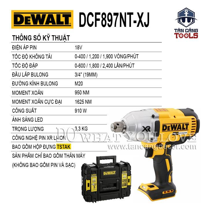 THÔNG TIN SẢN PHẨM: Xuất Xứ : Trung Quốc. Thương Hiệu : DEWALT – HÀNG CHÍNH HÃNG Mã Hiệu : DCF897NT Chất Liệu : Thân máy cấu tạo nhựa ABS tăng độ bền cho máy, cách điện kép. Sử Dụng Động Cơ Không Chổi Than. Điện Thế Pin : 18V Công Nghệ Pin XR Li-lon Tốc Độ Không Tải : 0 -400 / 1.200 / 1.900 Vòng / Phút. Tốc Độ Đập : 0 – 600 / 1.800 / 2.400 Lần / Phút. Công Suất : 910 W. Momen Xoắn : 950 Nm. Momen Xoắn Cực Đại : 1625 Nm. Đầu Lắp Bu Lông : 3/4 Inches ( 19 mm ). Trọng Lượng : 3.3 Kg. BỘ SẢN PHẨM BAO GỒM: + Thùng Nhựa + Thân Máy DCF897NT Sản phẩm bảo hành 3 Năm Toàn Quốc.