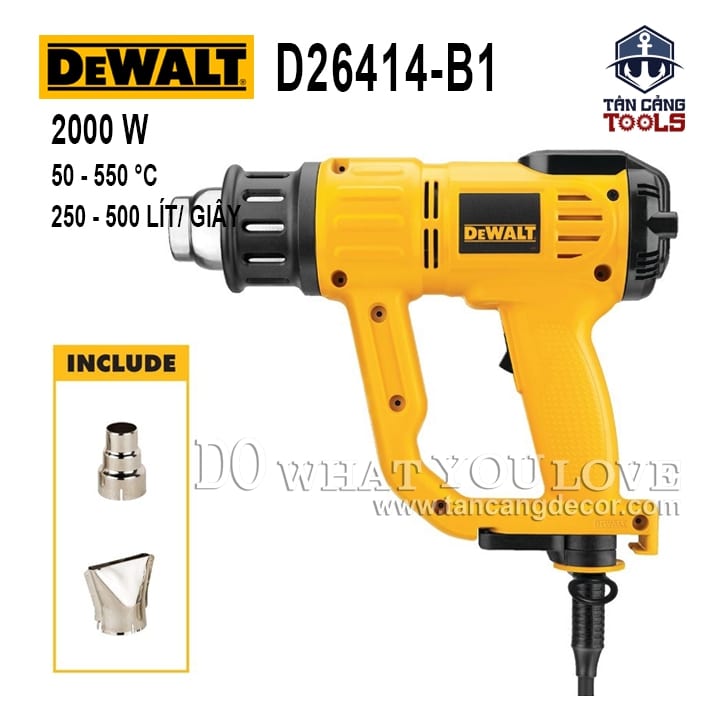 - Máy thổi nhiệt 2 Cấp Độ DeWalt D26414-B1 2000W ( Có Màn Hình Hiển Thị ) sử dụng để làm tan chảy hoặc kết dính các vật liệu với nhau. Hoặc dùng để gỡ bỏ các loại vật liệu khi chúng không còn sử dụng được nữa. Thích hợp để sử dụng trong sửa chữa, lắp ráp trong gia đình hoặc sử dụng trong sản xuất công nghiệp, cửa hàng dán xe máy, quán ăn…. như làm co màng nhựa, lột bỏ lớp sơn, nhựa cũ, uốn cong mica, rang,làm nóng thực phẩm, vật liệu….