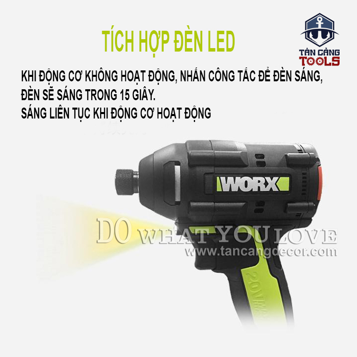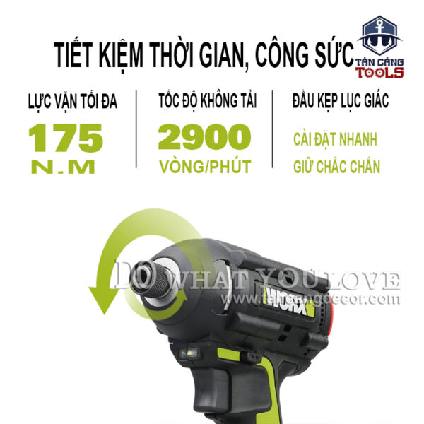 THÔNG TIN SẢN PHẨM: Xuất Xứ : Trung Quốc Sản Xuất Theo Tiêu Chuẩn Mỹ Thương Hiệu : WORX Hàng Chính Hãng https://www.worx.com Mã Sản Phẩm : WU294.1 Sử dụng động cơ không chổi than. Trọng Lượng : 1.7 Kg Tốc Độ Không Tải : 0 – 1.300 ; 0 – 2.100 ; 0 – 2.900 Vòng / Phút. Tốc Độ Đập : 0 – 1.600 ; 2.900 / 3.3000 Lần / Phút. Kích Thước : 14.5 x 7.5 x 24 Cm. Đầu Kẹp Lục Giác Chuẩn Châu Âu ( Chuôi Ngắn 6.35 mm ). Sử Dụng Điện Áp 20V. Thời Gian Sạc Đầy 60 Phút. Có 3 Cấp Điều Chỉnh Lực. Lực Vặn Tối Đa : 175N.m. Có Chế Độ Đèn Led. BỘ SẢN PHẨM BAO GỒM: + Thân Máy + Túi Xách + 2 Pin 20V 2AH – WA3593 Có Chế Độ Báo Pin. + 1 Sạc 20V + Móc Đeo + Nắp Nhựa Gắn Đầu Vít Ngắn 2 Đầu Đi Kèm. + Tuýp Mỡ. Sản Phẩm Bảo Hành Điện Tử 12 Tháng Từ Weldcom.