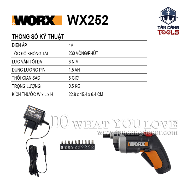THÔNG TIN SẢN PHẨM: Xuất Xứ : Trung Quốc Sản Xuất Theo Tiêu Chuẩn Mỹ Thương Hiệu : WORX Hàng Chính Hãng https://www.worx.com Mã Sản Phẩm : WX252 Trọng Lượng Máy : 0.5 Kg. Sử dụng điện áp sạc 220 V Điện Áp 4V. Tốc Độ Không Tải : 230 Vòng/ Phút. Kích Thước : 288 x 154 x 64 mm Lực Vặn Tối Đa : 1.5 N.m. Dung Lượng Pin : 1.5 Ah. Thời Gian Sạc : 3 Giờ. Có Đèn Led Chiếu Sáng. BỘ SẢN PHẨM BAO GỒM: + Thân Máy + Sạc 4V 1.5 Ah + Bộ Phụ Kiện Đầu Vít Tặng Kèm 10 Chi Tiết. Sản phẩm bảo hành 6 Tháng.