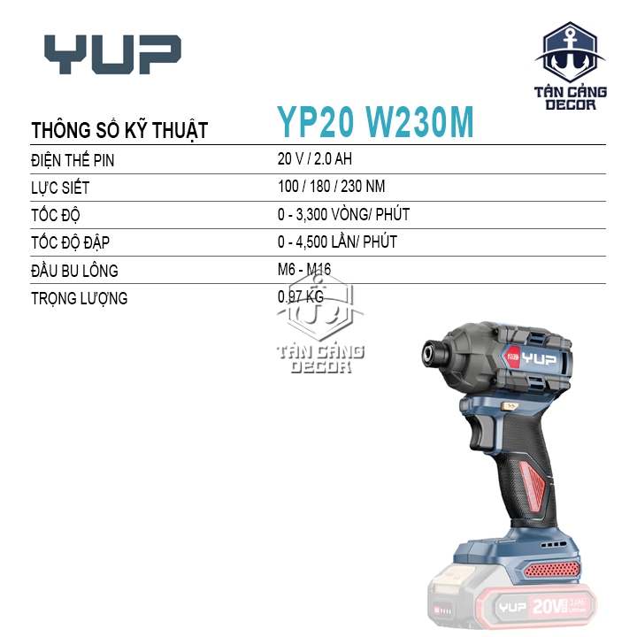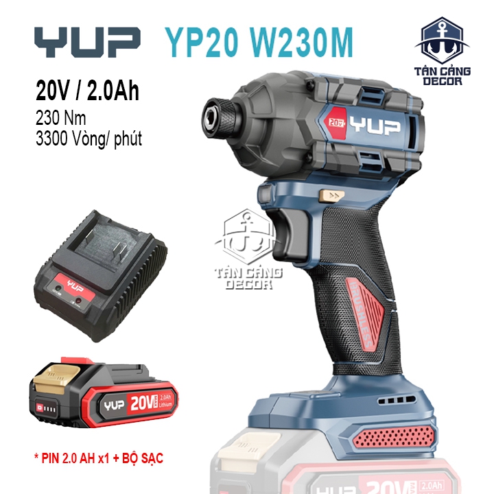 - Máy vặn vít dùng pin YUP YP20 W230M là một công cụ mạnh mẽ với lực siết cao, tốc độ nhanh và khả năng làm việc với các loại bu lông lớn hơn. Đây là một lựa chọn tốt cho những công việc đòi hỏi hiệu suất và sức mạnh cao hơn so với các dòng máy vặn vít thông thường.