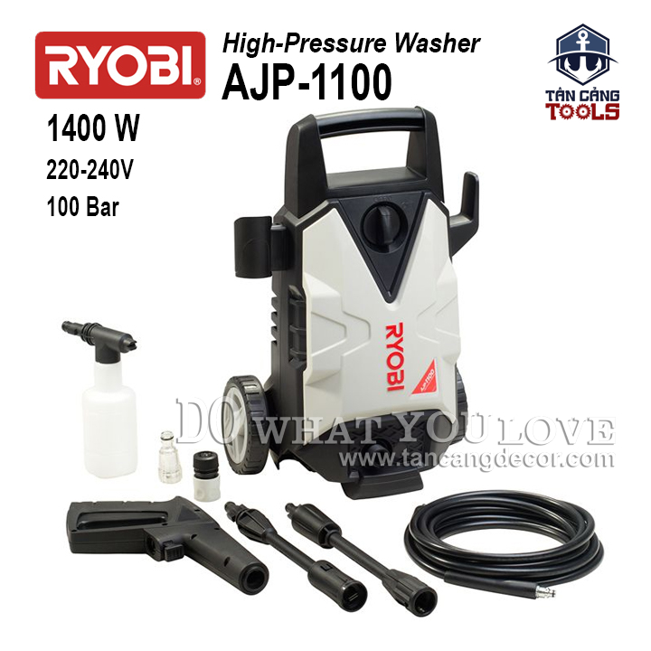 THÔNG TIN SẢN PHẨM: Xuất Xứ : Trung Quốc Thương Hiệu : RYOBI Mã Sản Phẩm : AJP-1100 Chất Liệu : Thân Máy Được Nhựa Cứng Tổng Hợp – Dây Xịt Chống Bẻ Gãy Động Cơ Chổi Than – Mô Tơ Lõi Đồng. Thân Máy Chống Nước Tiêu Chuẩn Cấp Độ II Sử Dụng Hệ Thống Kết Nối Nhanh Màu Sắc : Màu Trắng – Đen Trọng Lượng : 4.5 Kg. Công Suất : 1400W Áp Lực Tối Đa : 100 Bar ( 1450 Psi ) Áp suất đầu vào cực đại : 7 bar ( 102 Psi ) Kích thước : 26 * 29 * 48.5 cm Nhiệt Độ Nước Cấp Tối Đa : 40 Độ Sử Dụng Dòng Điện : 220V – 50Hz Lưu Lượng Nước Định Mức : 5.5 Lít / Phút Cơ Chế Tự Hút Nước. BỘ SẢN PHẨM BAO GỒM : + Máy Rửa Áp Lực + Bình Xịt Xà Phòng + Dây xịt áp lực 3 m + Đầu Lọc Nước Cấp. + Dây Nguồn Điện 3 m + Cần Xịt + Đầu Gài Nhanh Kết Nối Nước Vào, Nước Ra + Không Bao Gồm Ống Cấp Nước Sản Phẩm Bảo Hành 1 Năm Lưu Ý : Không Xịt Trực Tiếp Vào Động Vật Và Trẻ Em.
